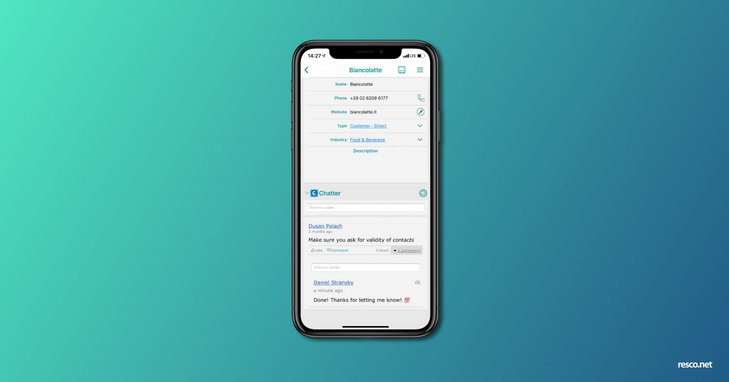 The collaboration platform Salesforce Chatter becomes available for all companies using Resco with Salesforce as a backend. It allows employees to communicate and share information about a particular record in real-time. Various settings are available for synchronization and offline use of the feature. Users can choose whether they want to sync the chat always when online, refresh it only when needed, or during synchronization of all data.